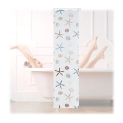 Das semitransparente Badrollo im maritimen Ocean-Motiv kann leicht an der Zimmerdecke angebracht werden und ist eine moderne Alternative zum herkömmlichen Duschvorhang. Durch die Beschwerung am unteren Ende liegt das Duschrollo gerade an der Dusch- oder Badewanne an, sodass Ihre Fliesen vor Wassertropfen geschützt werden und kein lästig herumwedelnder Vorhang Sie beim Duschen stört. Bei Nichtgebrauch ziehen Sie das trockene Rollo einfach am Seilzug nach oben, sodass es dezent zusammengerollt wird.