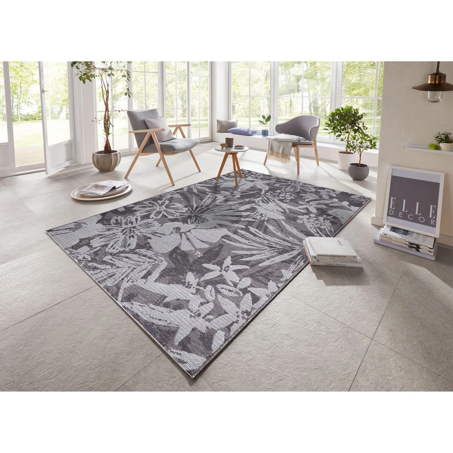 Dieser einfarbige Outdoor Teppich von ELLE Decoration verschönert Ihren Balkon durch seine edle Anmutung. Das klare florale Design sorgt für eine entspannte Optik beim Sonnenbad auf Ihrer Terrasse. Dezente Pastelltöne verstärken diesen Effekt und können ebenso im Innenbereich für ein gemütliches Ambiente sorgen. Der strapazierfähige Flachgewebe Teppich ist hochwertig verarbeitet und natürlich wetterfest. Aus 100% Polypropylen