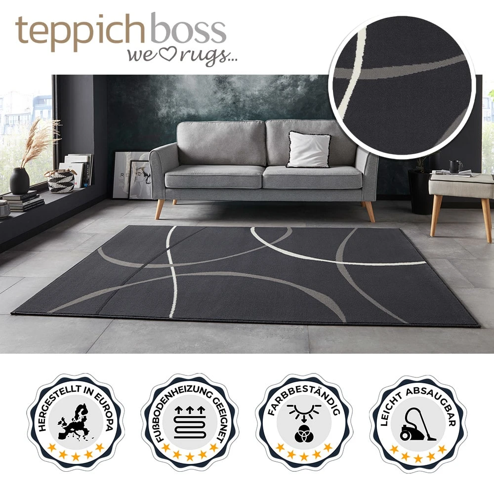 Dieser attraktive Design Teppich wird Ihrem Wohnbereich eine erfrischende Atmosphäre verleihen. Die schwungvollen teilrunden Streifen Muster machen diesen Wohnraumteppich zu einem echten Hingucker in Ihren Räumlichkeiten. Modische Farbvariationen runden die elegante Erscheinung ab. Die Kunstfaser Polypropylen sorgt für eine lange Lebensdauer und gute Wärmedurchlässigkeit im Einsatz mit Fußbodenheizungen. Wir empfehlen eine Anti-Rutsch-Unterlage, um auf glatten Böden ein mögliches Verrutschen zu vermeiden.