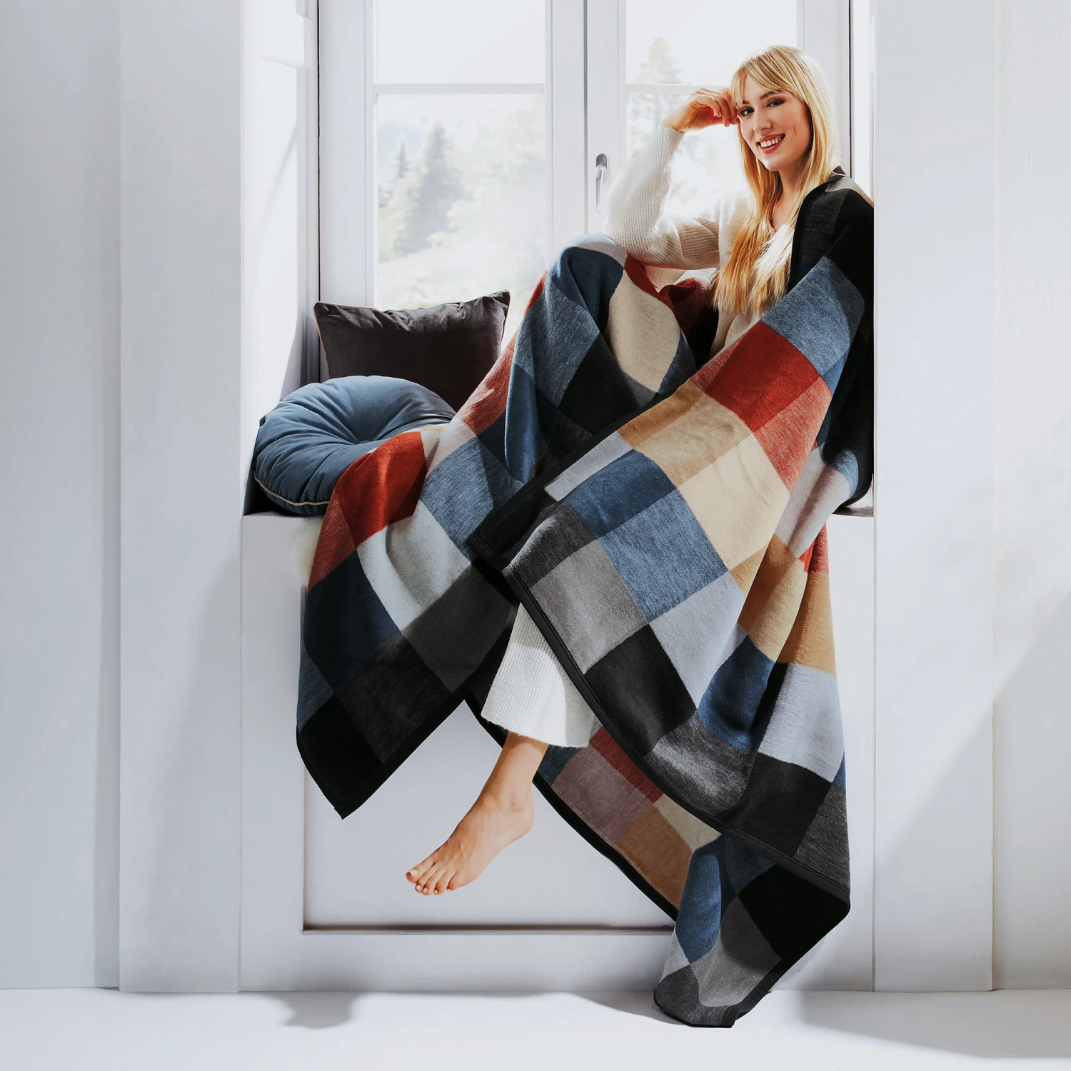 Erwin Müller Jacquard Wohndecke. Ein Traum für gemütliche Stunden auf dem Sofa. Gerne lassen Sie sich von der samtigen Qualität verwöhnen. Die angenehme Materialmischung macht dieses Wohnaccessoire so kuschelweich, hautsympathisch, atmungsaktiv, pflegeleicht und strapazierfähig. Rundum mit Veloursband eingefasst.